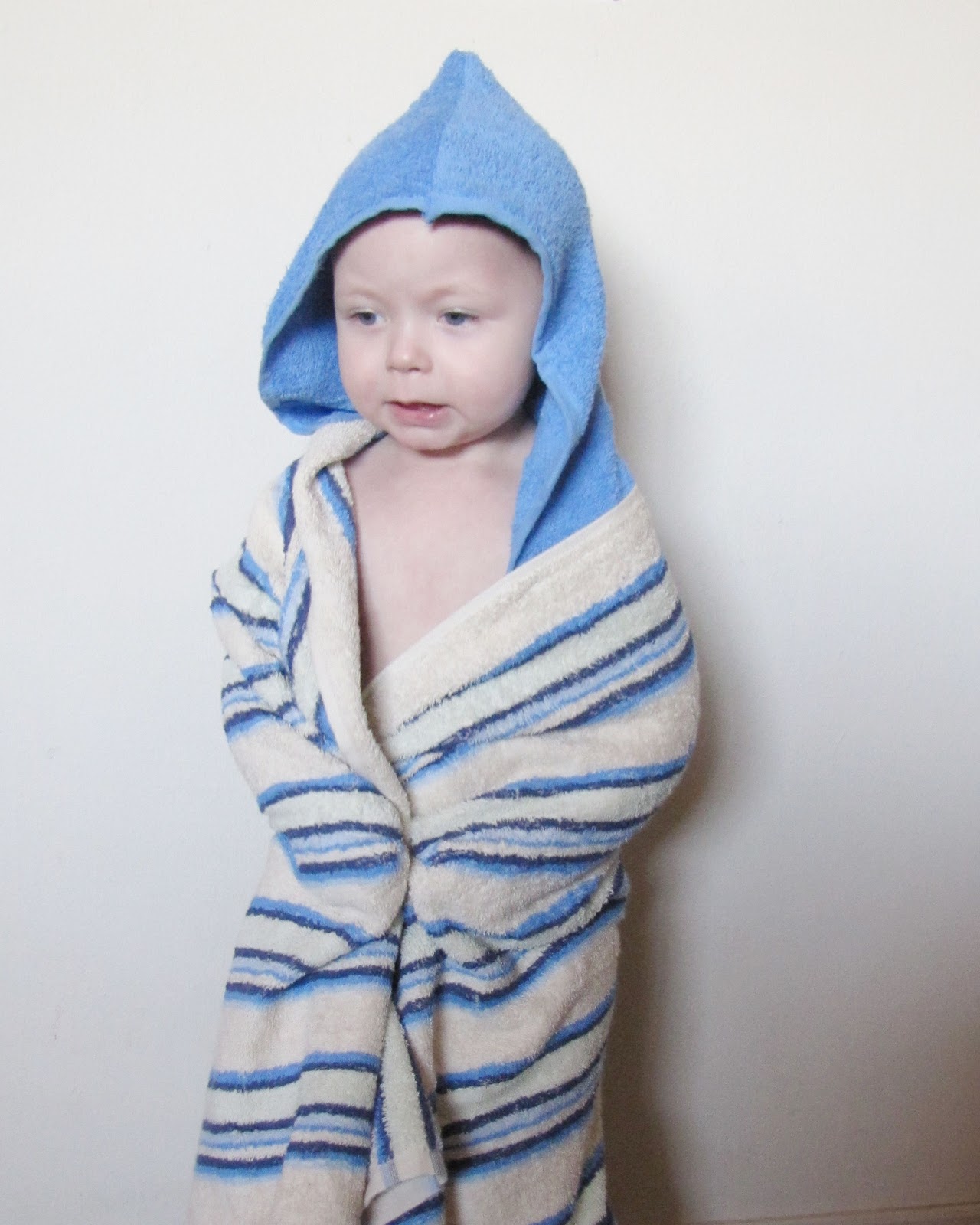 See he will still smile really big for mommy!!!  You can't really tell from these photos, but these towels are HUGE so they have room to grown into them.  I am going to be making several of these for my nieces and my nephew so if yall are interested in a quick tutorial let me know and I will put one together.  So until next time........